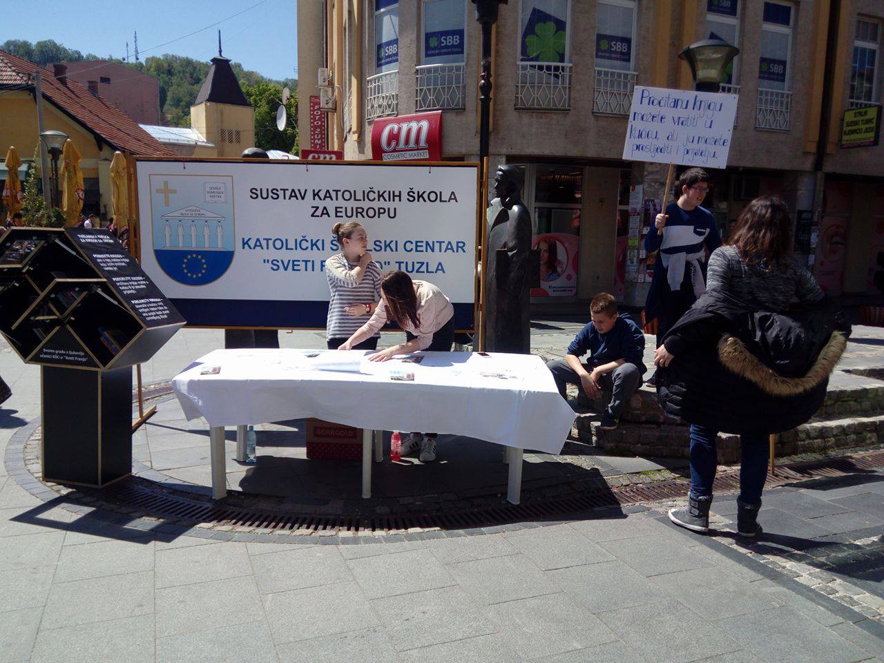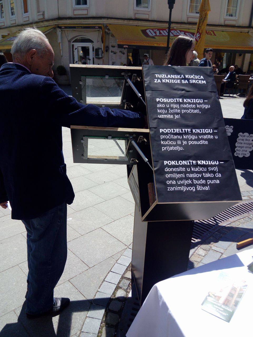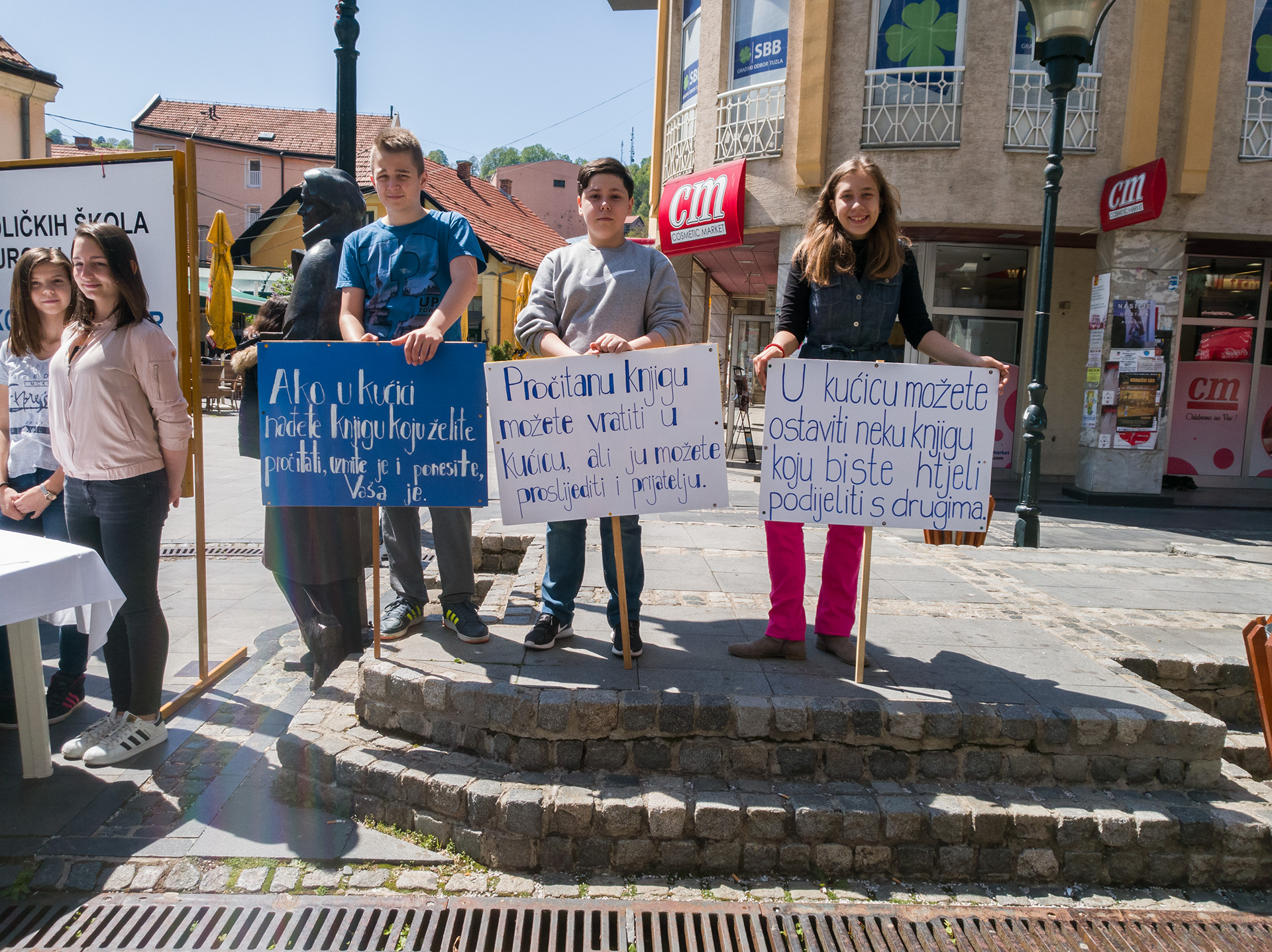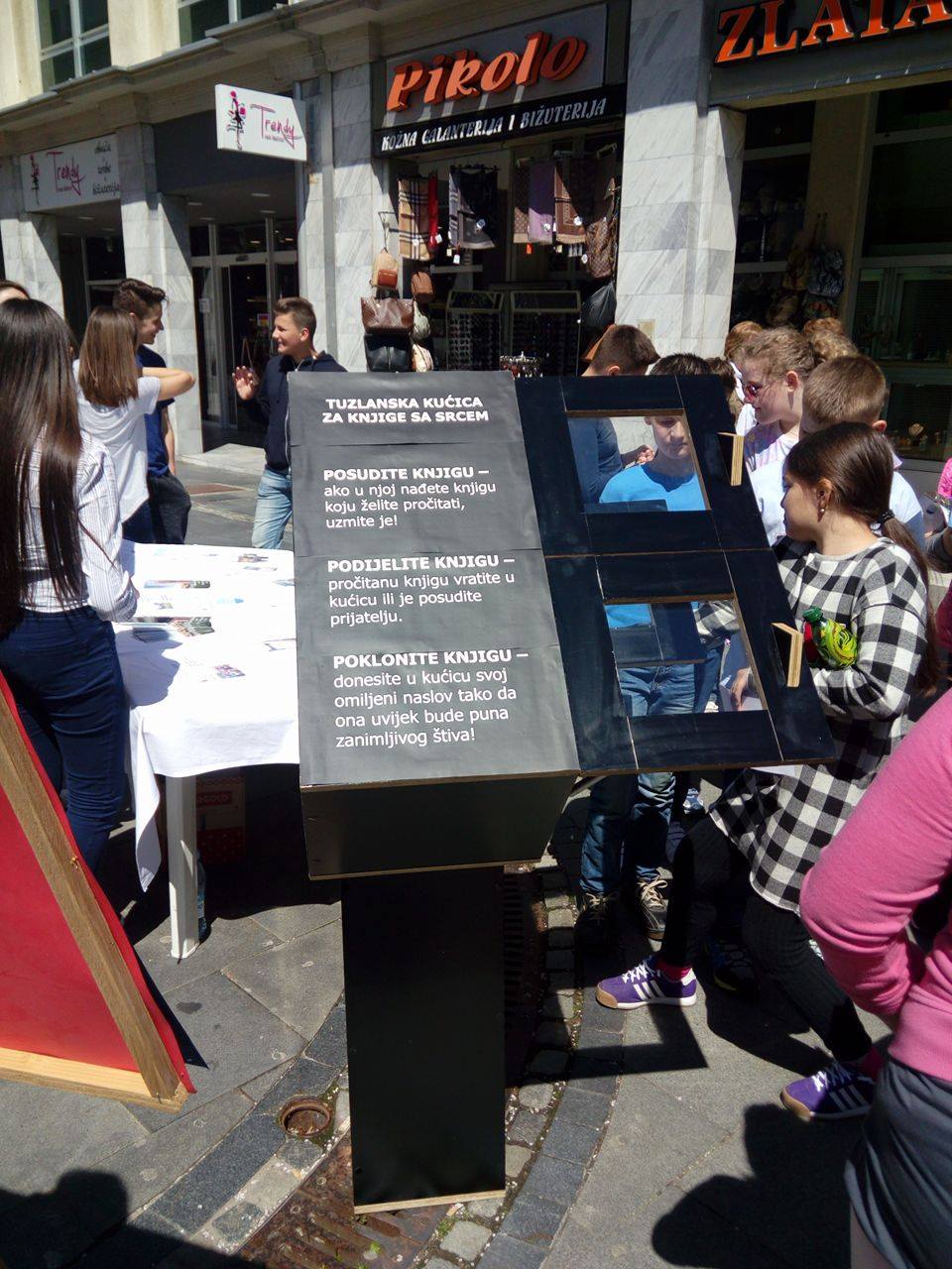 Jučer, 24.04.2017.godine, su privedene kraju aktivnosti vezane za obilježavanje Međunarodnoga dana knjige kojima se pokušala podignuti svijest o kulturi čitanja. Završni događaj bila je prezentacija projekta Little Free Library na kojemu je mjesecima radio vrijedni tim učenika i nastavnika Centra predvođen idejnim tvorcem, učiteljicom Ivanom Pejić. Projekt je podržala i Fondacija tuzlanske zajednice. Naime, riječ je o kućicama za knjige koje će biti postavljene u školskom dvorištu i u gradu. Njihova je namjena i primarni cilj poticanje naših sugrađana na druženje s pisanom riječju. Učenici 8.a zajedno s nastavnicom Marijanom Visković preuzeli su ulogu promotora te zadatak obavili besprijekorno. Oni su zainteresirane prolaznike upoznali s načinom korištenja mini knjižnica. Pojasnili su da će se kućice moći koristiti tako što će u njima svi koji žele, moći ostaviti, tj. darovati knjige, te iz njih posuditi one koje tamo zateknu, a učine im se zanimljive za čitanje. Dizajn kućica potpisuje likovna sekcija Centra na čelu s profesorom Borisom Pejićem. Uz prezentaciju projekta učenici su dijelili i letke na kojima su bile ispisane simbolične poruke o značaju i bogatstvu koje se stječe čitanjem knjiga.